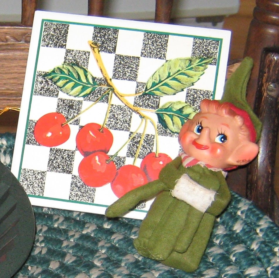 I've seen this cherry pie tin decoration in some catalog, but it slips my mind. And a cutie elf who has "real" hair!