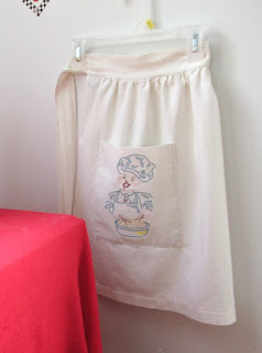 A nice sturdy vintage apron with an embroidered cook who looks like she's deranged or on happy pills or something, lol!